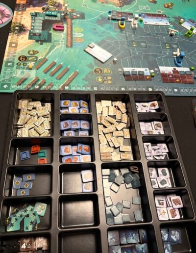Had ik al gezegd dat Theasaurus prachtig is vormgegeven? Het grote hoofdbord is prachtig geïllustreerd met een tropisch gebied vol gebouwen, strand en zeelocaties. Dit expert spel kent vele tokens, blokjes, fiches, bootjes, en een paar vliegtuigen. Verreweg de meeste kleine onderdelen zitten in een grote opbrengdoos met veel vakjes en een deksel. Enorm handig.