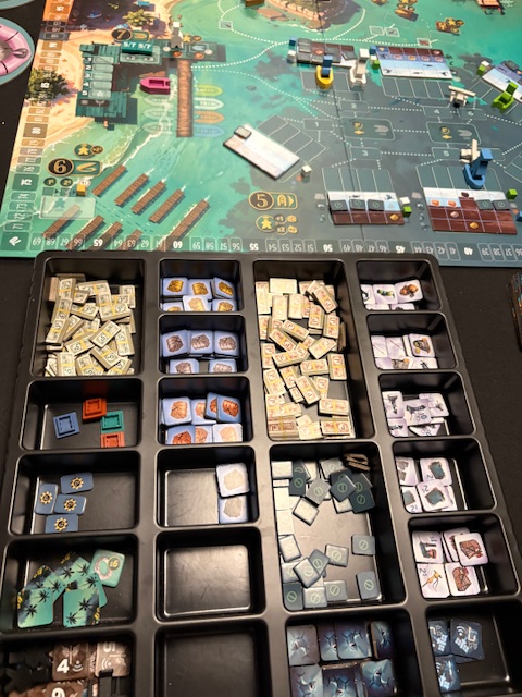 De opzet valt door deze grote doos mee, de doos met onderdelen zet je zo neer op tafel. Verder nog wat spelersbordjes vullen, kaarten schudden en schatkaarten neerleggen. Dit gaat best snel.
