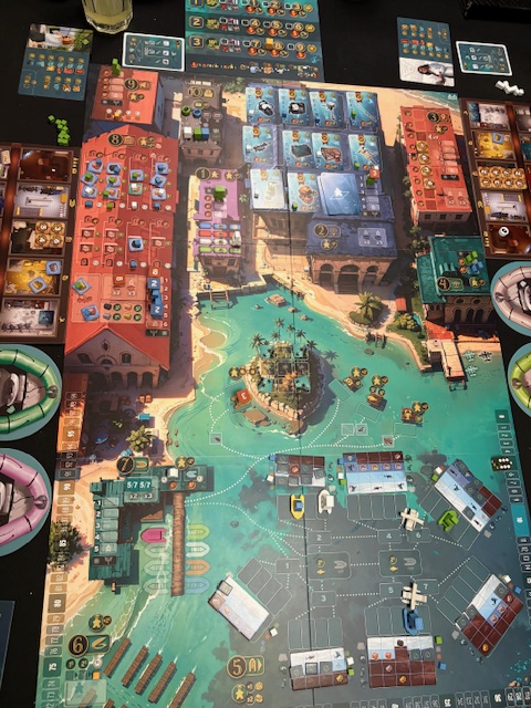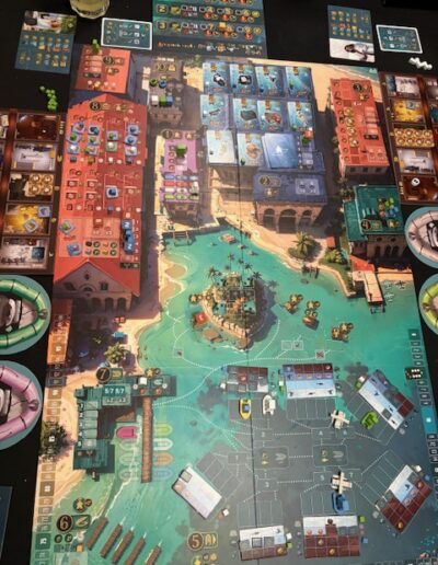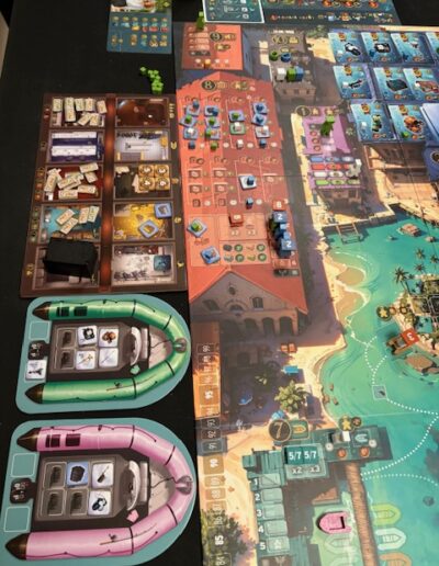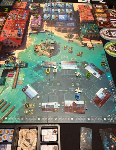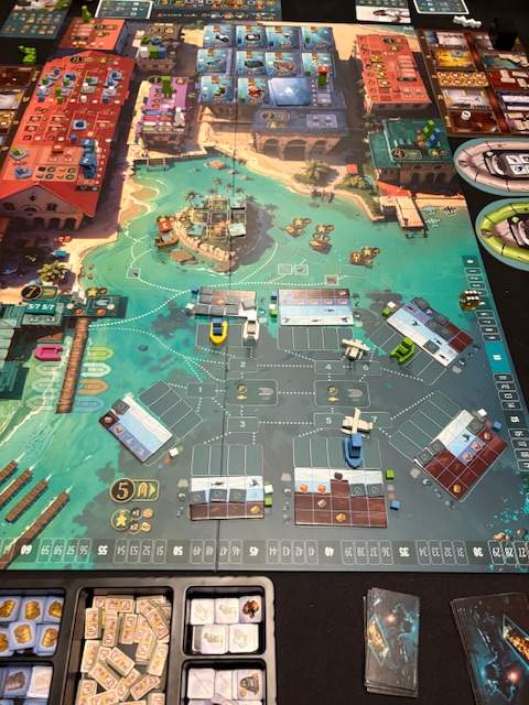 Did I mention that Theasaurus is beautifully designed? The large main board is beautifully illustrated with a tropical area full of buildings, beaches, and seaside locations. This expert game features many tokens, blocks, counters, boats, and a few airplanes. The vast majority of small parts come in a large, compartmentalized box with a lid. Very handy.