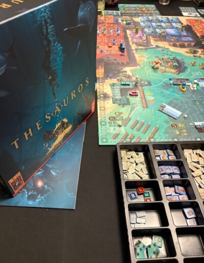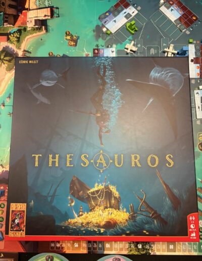 In Thesaurus ga je schatjagen op zee. In een prachtig vormgegeven expert bordspel bezoek je veel locaties om duikspullen, duikkaarten, boten te kopen en breng je jouw gevonden schatten terug naar het museum. Maar, pas op voor de haaien.