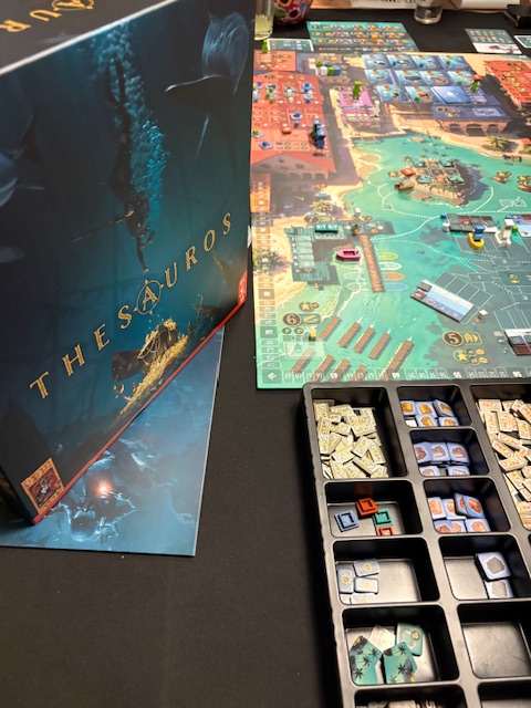 Thesaurus heeft me aangenaam verrast. Ik hou wel van een goed spel waarin het thema goed toegepast wordt. En dat is hier zeker het geval. De acties kloppen met het duiken naar schatten. Je moet spullen, schatkaarten en boot hebben. Je verkoopt je schatten aan het museum. Allemaal erg logisch. De acties afzonderlijk zijn dan ook niet ingewikkeld, het is vooral het hoeveelheid keuzes dat maakt dat Thesauros een expertspel is. Het geldbeheer en daarmee het storten op de bankrekeningen is echt flink vooruit plannen. Dat wordt vanzelf makkelijker als het Thesauros vaker speelt. Het ziet er prachtig uit en speelt goed. Oh wat is het toch lekker als je een mooie schat opduikt en meteen in je vliegtuig stop om vervolgens in dezelfde ronde nog in het museum neer te leggen. Je voelt je een echt ontdekker!