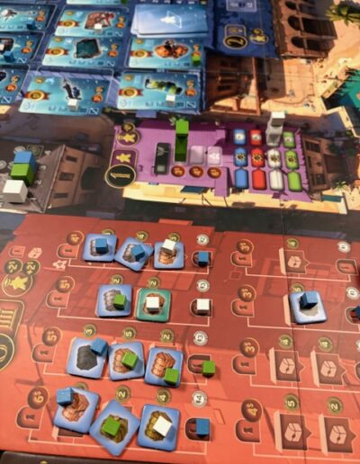 The design is easy thanks to this large box; the box with parts is easy to place on the table. Then you fill the player boards, shuffle the cards, and lay out the treasure cards. This goes pretty quickly.