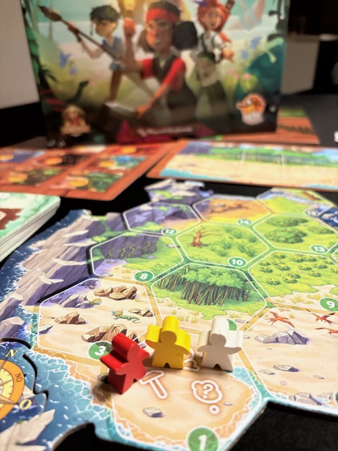 The first setup is a basic map of the island with meeples for the number of players. Download the Toriki app on your phone and start the story. The app guides you through the entire game.