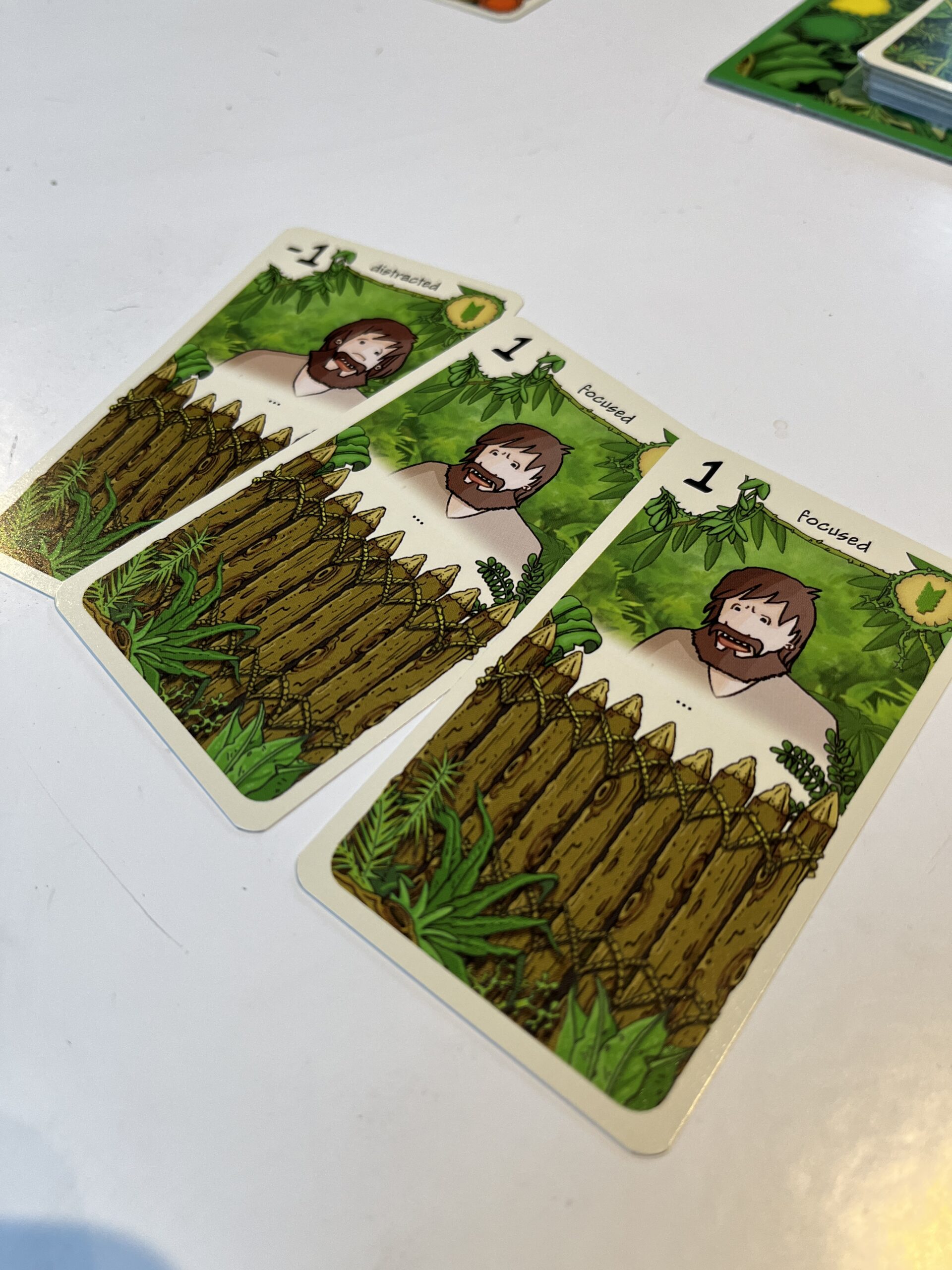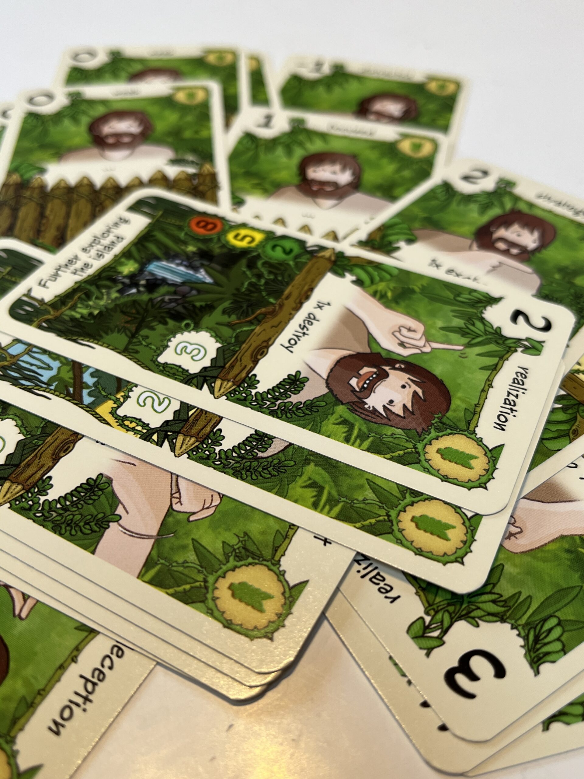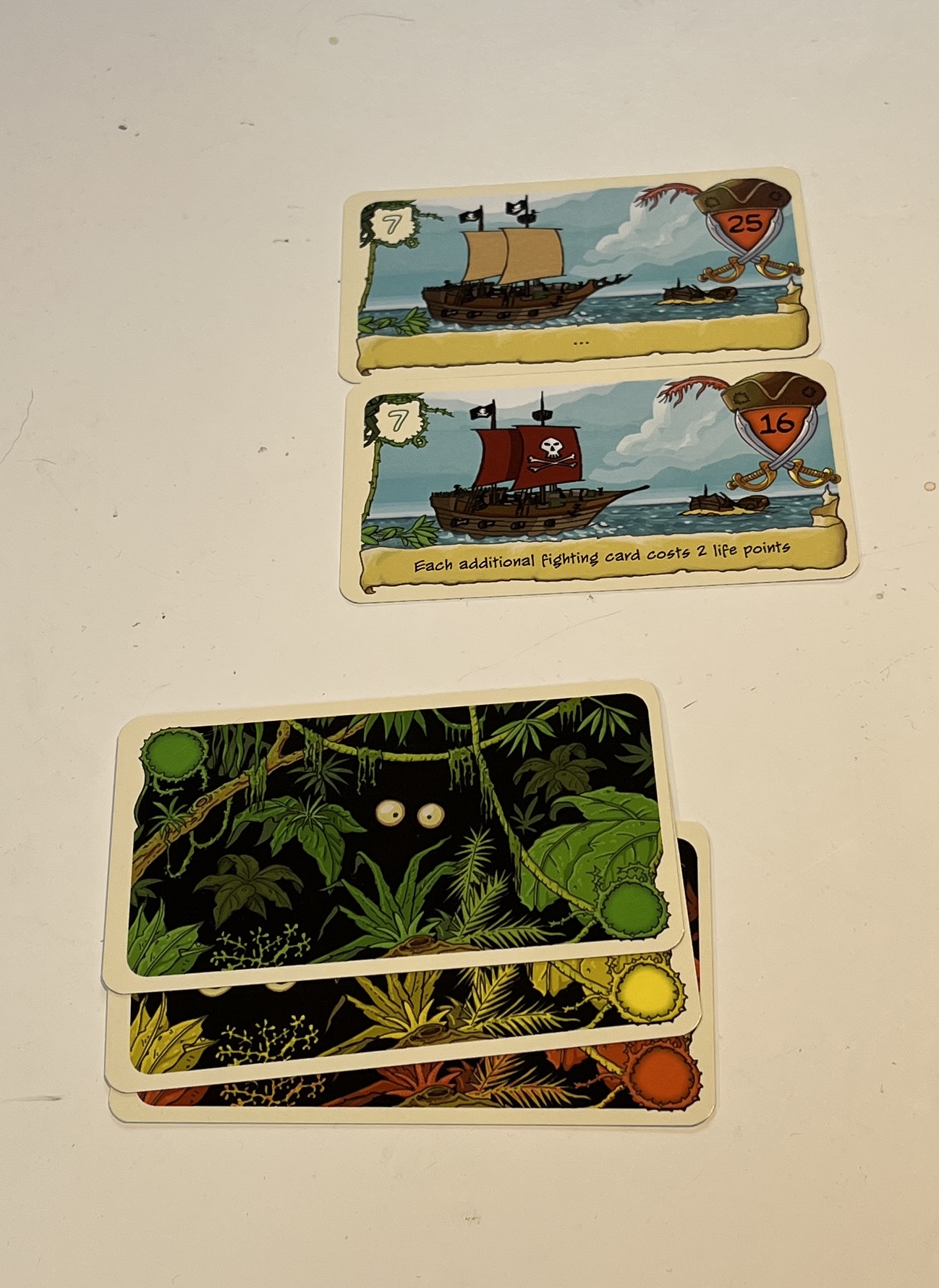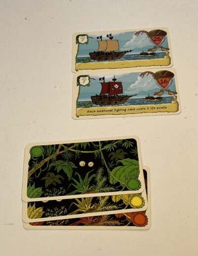 You try to build your weapon deck (“deckbuilding”) to overcome the increasingly difficult obstacles. Initially, your deck is weak, and you gradually improve to eventually defeat the pirates. It’s also a “push your luck” game, because you turn over cards and hope that one extra card will help you drive away the threat. In my case, this means you keep pushing your luck so hard that you end up with too few lives, unfortunately. 😉
