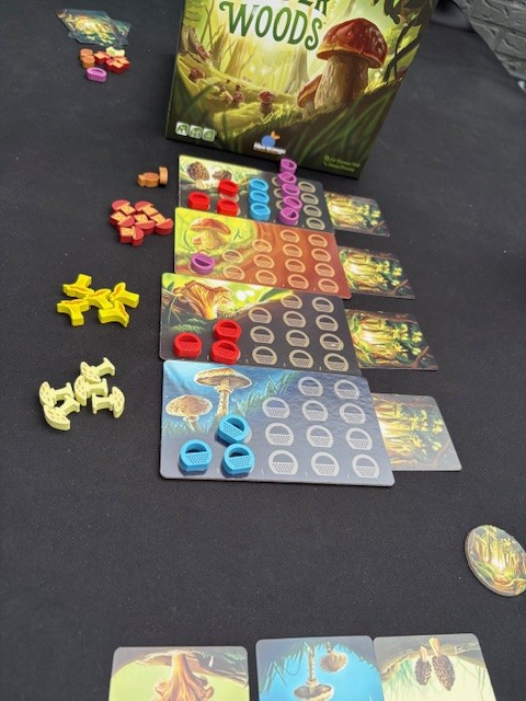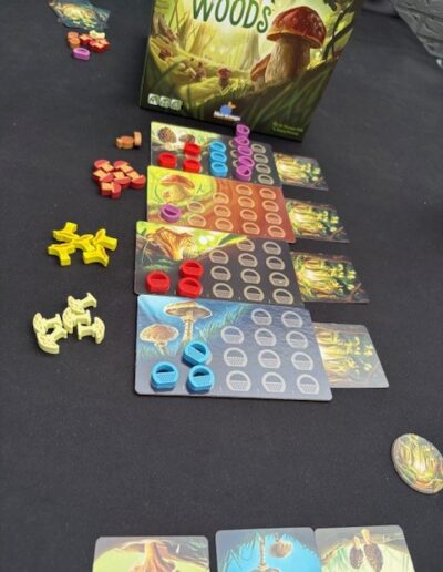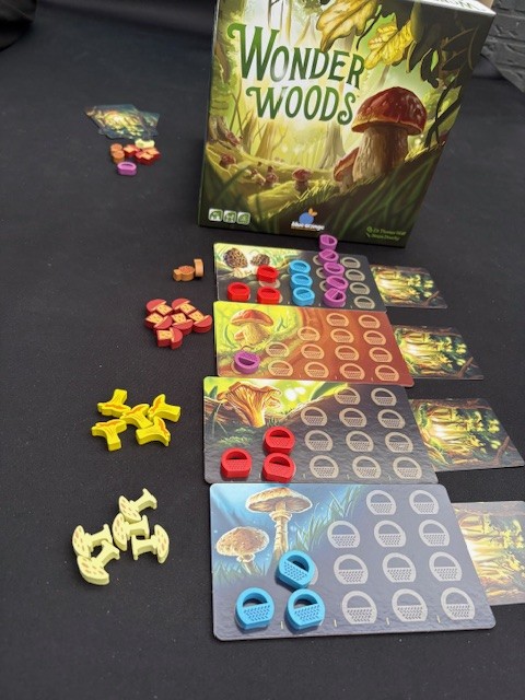 Wonder Woods is een klein spel en de opzet is dan ook snel en makkelijk. Elke speler krijgt 7 mandjes in zijn kleur en legt er 2 daarvan apart. In het midden leg je de 4 grote tegels en de bijbehorende paddenstoelen er naast. Per paddenstoel soort zijn er puntenkaart met 1,3,5 of 7 punten. Schud deze kaarten per soort en leg een kaart gedekt bij de bijbehorende paddenstoel tegel. De puntenkaart van een soort bepaalt hoeveel punten die soort per paddenstoel scoort. Dus 1,3,5 of 7 punten per paddenstoel. Dat weet je niet omdat de puntenkaart gedekt neergelegd wordt. De andere, niet gebruikte, puntenkaarten worden onder de spelers verdeeld. Hiermee kan een speler elimineren welk puntenkaart er niet gescoord wordt en is er dus een beetje informatie welke paddenstoel soorten meer scoren dan anderen.