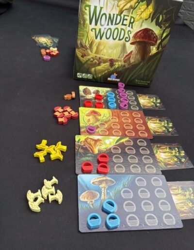 Wonder Woods is duurzaam gemaakt, er zit geen plastic in de doos. Het hoofdbord bestaat uit 4 grote tegels met elk een paddenstoelsoort en plekjes om mandjes op te leggen. De afbeeldingen zijn mooi gemaakt. Elke spelers krijgt mandjes (van hout) en een paar kaarten. De paddenstoelen zelf zijn ook van hout gemaakt en geverfd. Dus een allemaal goed verzorgd en past prima in de doos.